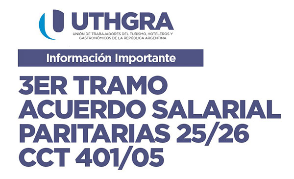 Noticias UTHGRA INFORMA: ¡NUEVO ACUERDO PARITARIO TERCER TRAMO!abril 1, 2026Información sobre feriados Marzo 2026marzo 18, 2026Acceder a la generación de la boletasmarzo 16, 2026✅️ 8M – Día Internacional de la Mujer #UTHGRAViedmamarzo 9, 2026Entregamos más de 300 kits de útiles escolaresmarzo 9, 2026ALERTA SISTEMA INFORMÁTICOmarzo 9, 2026Escala de Sueldos Acuerdo Salarial 2025-2026noviembre 13, 2025Recibo de Sueldo Empleados UTHGRA – COMEDORES 401/05noviembre 7, 2025Los trabajadores hoteleros y gastronómicos exigimos una urgente resolución judicial y una nueva fecha de elección YAnoviembre 4, 2025 Ver más noticias Accesos directos Seccional Viedma Información institucional acerca de UTHGRA Viedma. Más info Turismo ¡Disfrutá tus vacaciones a full con los beneficios para afiliados! Más info Capacitaciones Conocé todo acerca de la Secretaría de Capacitación y Formación Profesional. Más info Planilla de Sueldos Información acerca de acuerdos salariales. Más info ¡Un gran equipo!