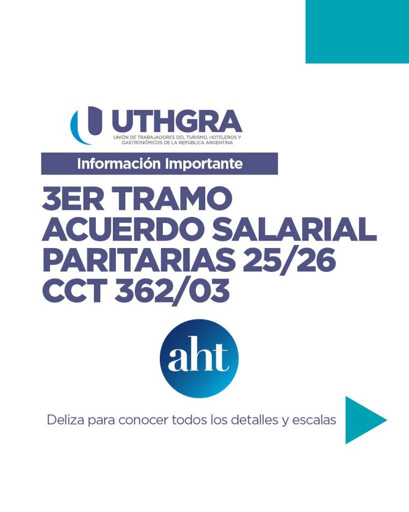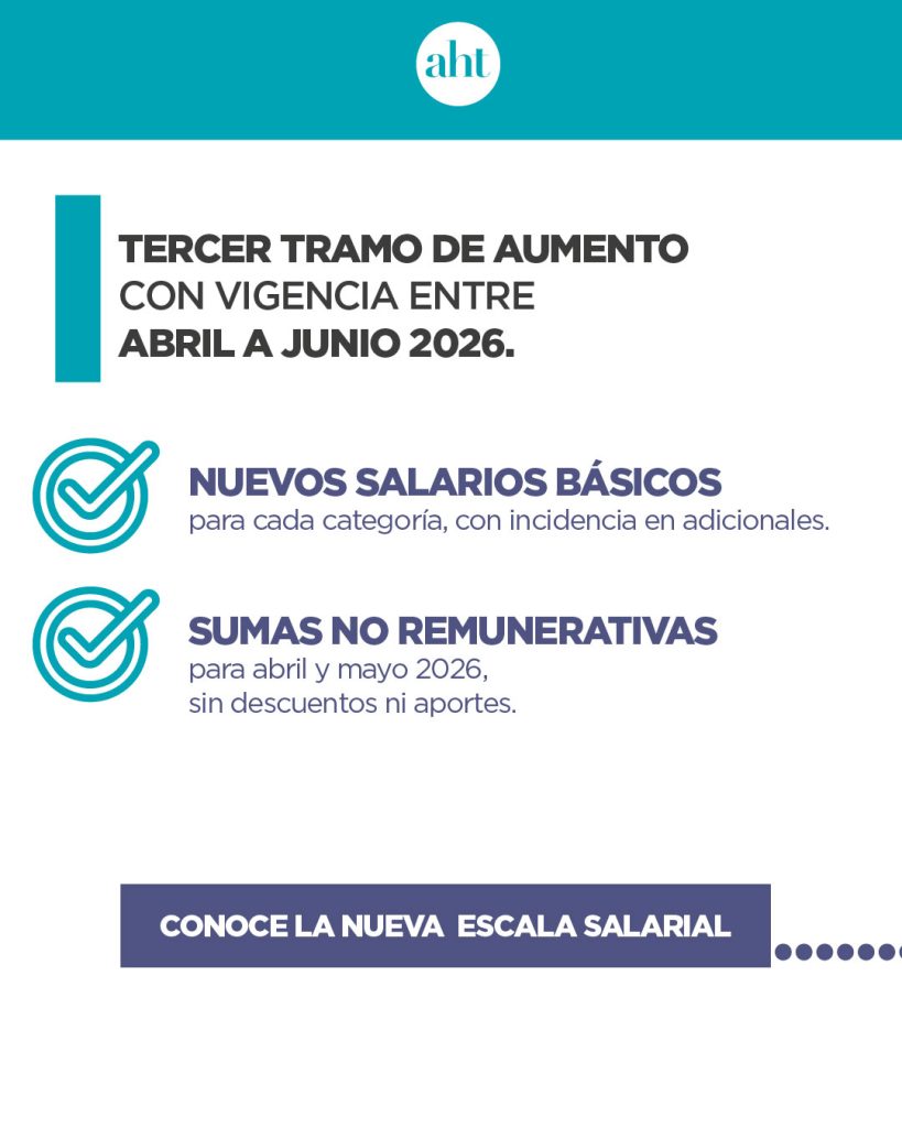 ✅ En el marco de la paritaria 2025/2026, se acordó con AHTRA el tercer tramo de aumento con vigencia entre abril y junio 2026.